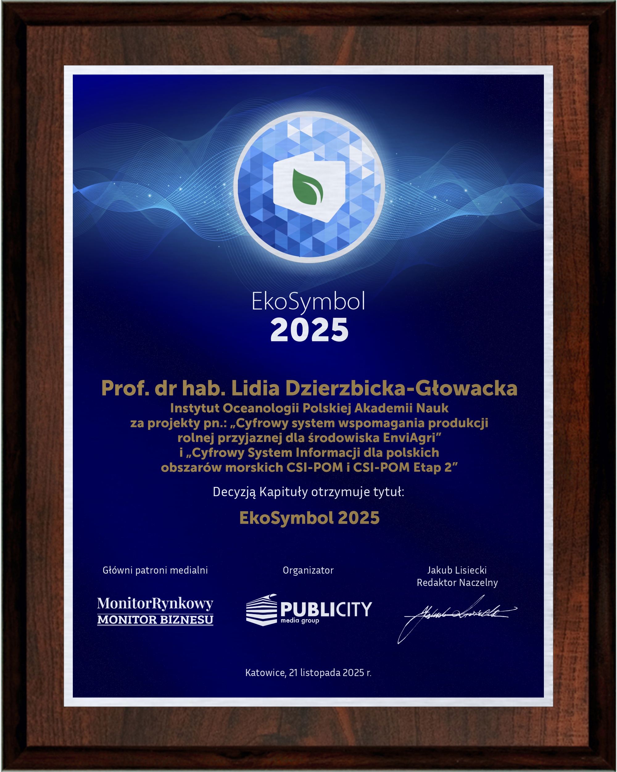 Prof. dr hab. Lidia Dzierzbicka-Głowacka Instytut Oceanologii Polskiej Akademii Nauk otrzymuje nominację do tytułu EkoSymbol 2025 za projekty pn.: "Cyfrowy system wspomagania produkcji rolnej przyjaznej dla środowiska EnviAgri" i "Cyfrowy System Informacji dla polskich obszarów morskich CSI-POM i CSI-POM Etap2, w ogólnopolskim programie prowadzonym na łamach "Monitora Biznesu", niezależnego dodatku do "Rzeczypospolitej", "Monitora Rynkowego", niezależnego dodatku do "Dziennika Gazety Prawnej" oraz "Pulsu Biznesu" .