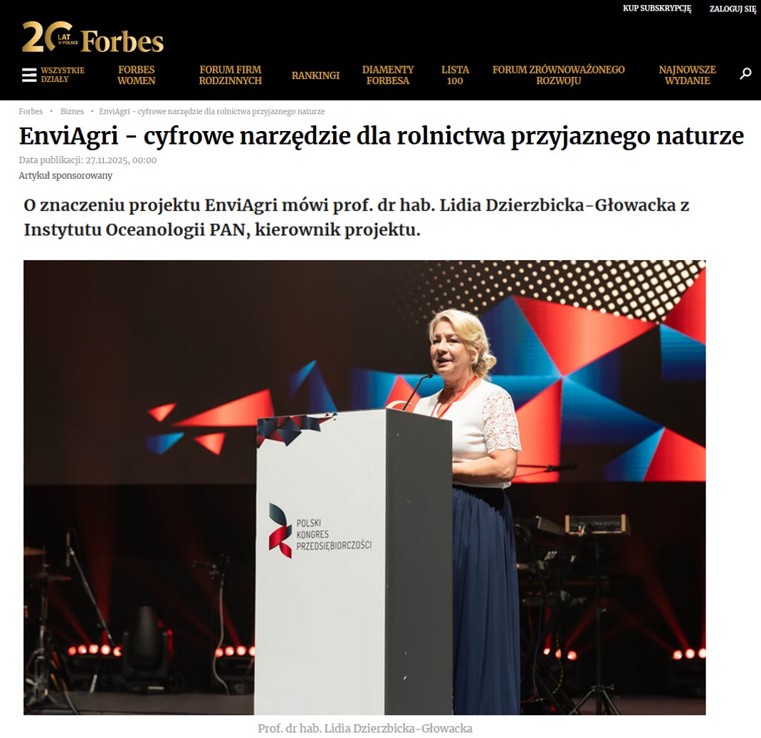 Na stronie portalu Forbes, w dziale Biznes, ukazał się artykuł „EnviAgri - cyfrowe narzędzie dla rolnictwa przyjaznego naturze”, w którym o znaczeniu projektu EnviAgri mówi prof. dr hab. Lidia Dzierzbicka-Głowacka z Instytutu Oceanologii PAN, kierownik projektu. https://www.forbes.pl/biznes/enviagri-cyfrowe-narzedzie-dla-rolnictwa-przyjaznego-naturze/qjhwhc9